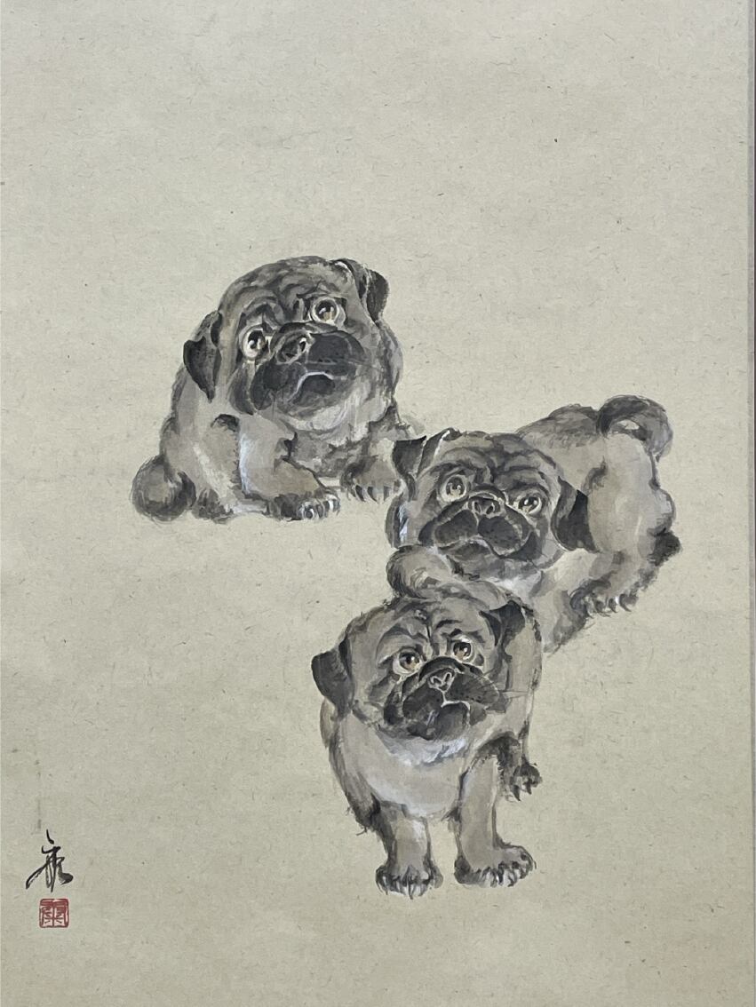 ふっくらとした体つきとつぶらな瞳が愛らしい、五匹のパグを描いた作品です。